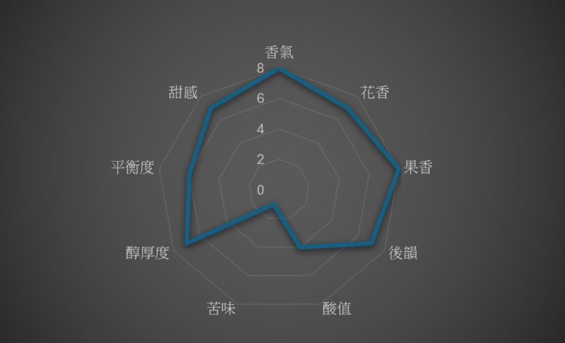 風味描述:入口帶有水蜜桃、濃縮葡萄汁的風味,伴隨著橙皮與花香;尾韻帶有柑橘水果的酸甜感